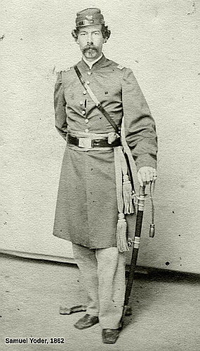The four oldest Yoder brothers soon left the community and, contrary to Amish teachings against taking up arms, joined the Union Army during the Civil War. Samuel enlisted on April 19, 1862 as a private in Company D of the 128th Regiment of the Ohio Volunteer Infantry and rose to Second Lieutenant in the 178th Regiment. He managed to get through the war without a major injury, but his younger brothers Moses and Jacob died. Noah was severely injured in battle and lost a leg.³