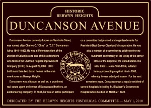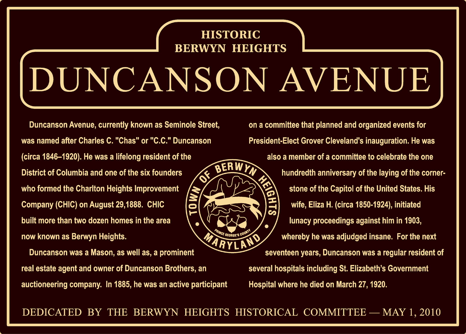 Duncanson Avenue, currently known as Seminole Street, was named after Charles C. “Chas” or “C.C.” Duncanson (circa 1846–1920). He was a lifelong resident of the District of Columbia and one of the six founders who formed the Charlton Heights Improvement Company (CHIC) on August 29, 1888. CHIC built more than two dozen homes in the area now known as Berwyn Heights.