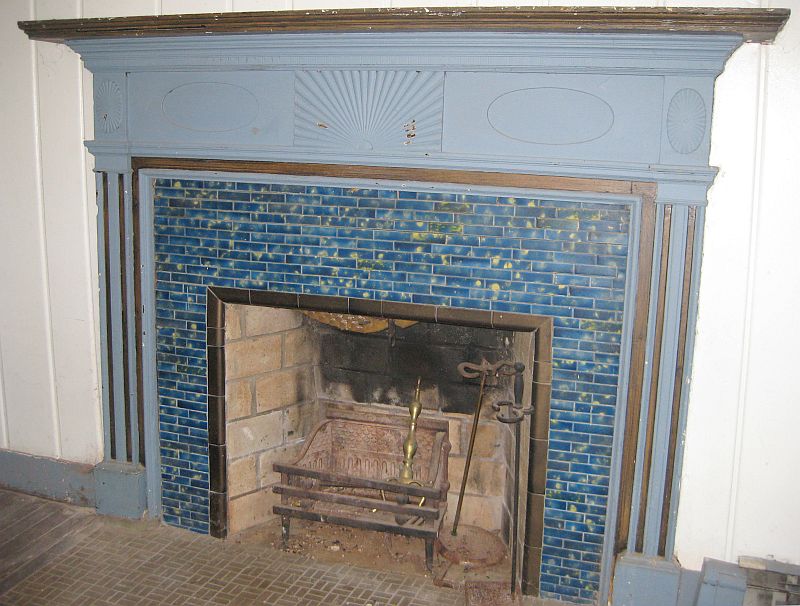 Fireplace in one of two parlors. It has an original wooden mantel but the tile work probably dates from the 1960s.
