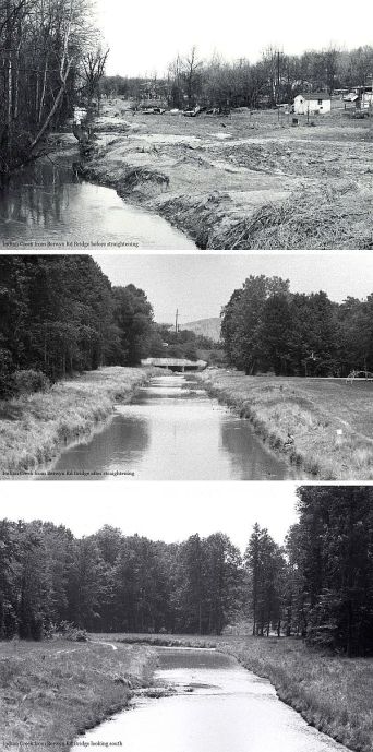 Other readers, including Fred Flaherty and Debbie Pitts, shared memories about fishing in the creek, which apparently continued after the widening. Note the boy with his rod in the lower right of the second photo. Mary Lou Milstead and Bettie Prosise in a BHHC oral history recording confirm that anglers often caught catfish and that the river valley served as a great playground.